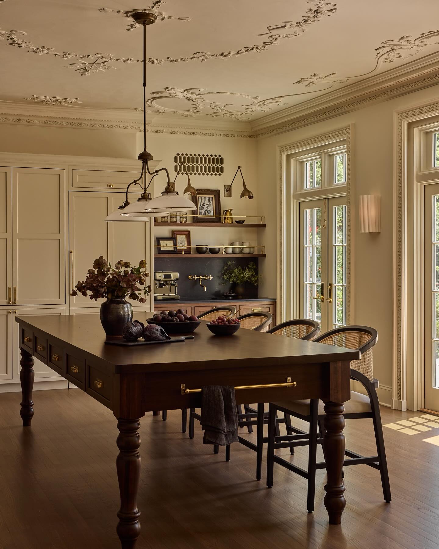 Dark wood also shines when paired with classic craftsmanship. Think carved island legs, traditional millwork, ornate plaster ceilings, and antique-style lighting.