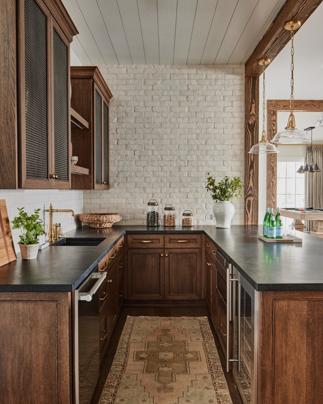 Designers are also mixing wood tones more freely now. Dark cabinetry can live alongside lighter oak floors or painted walls, creating depth instead of a perfectly matched palette.