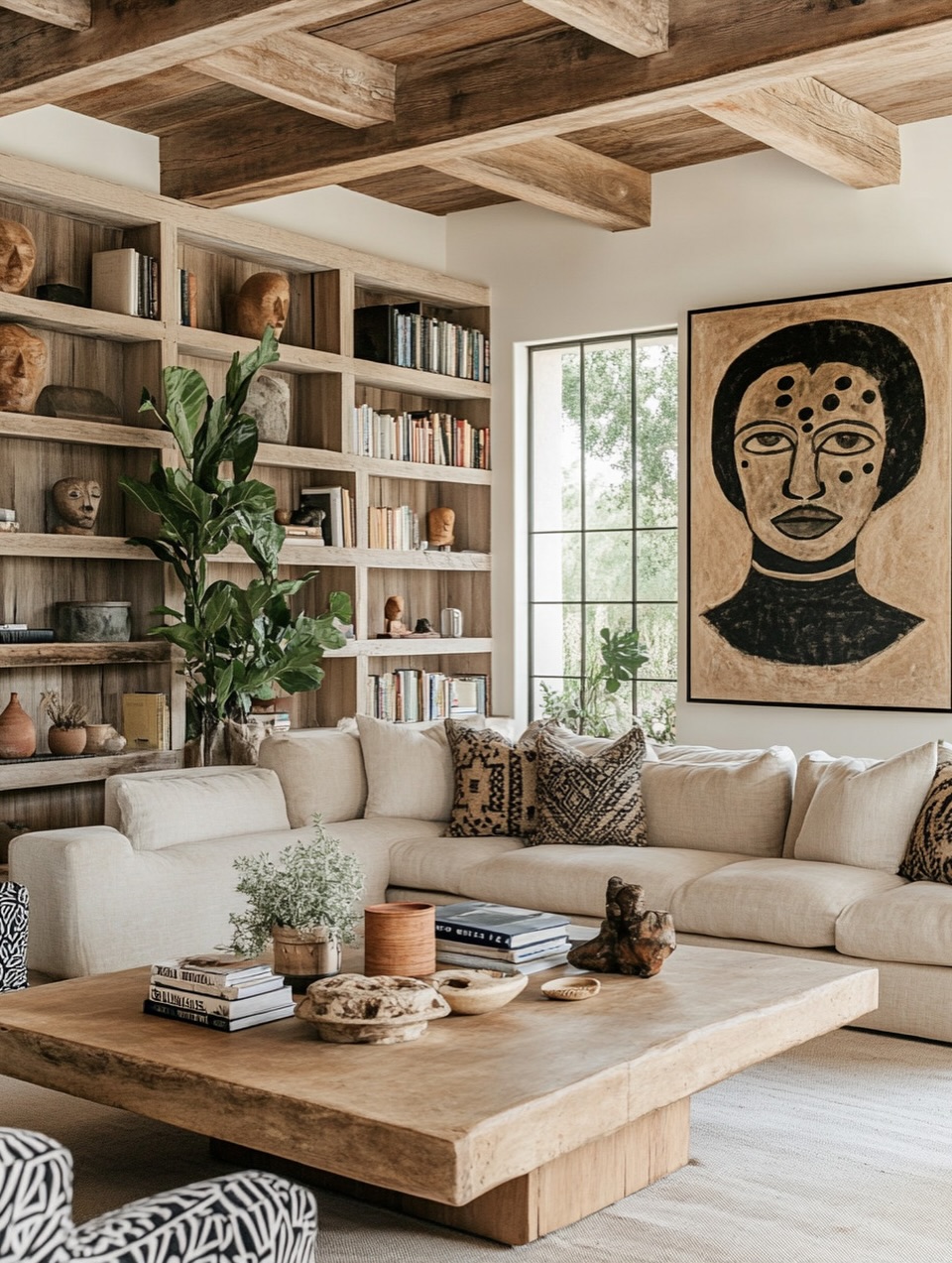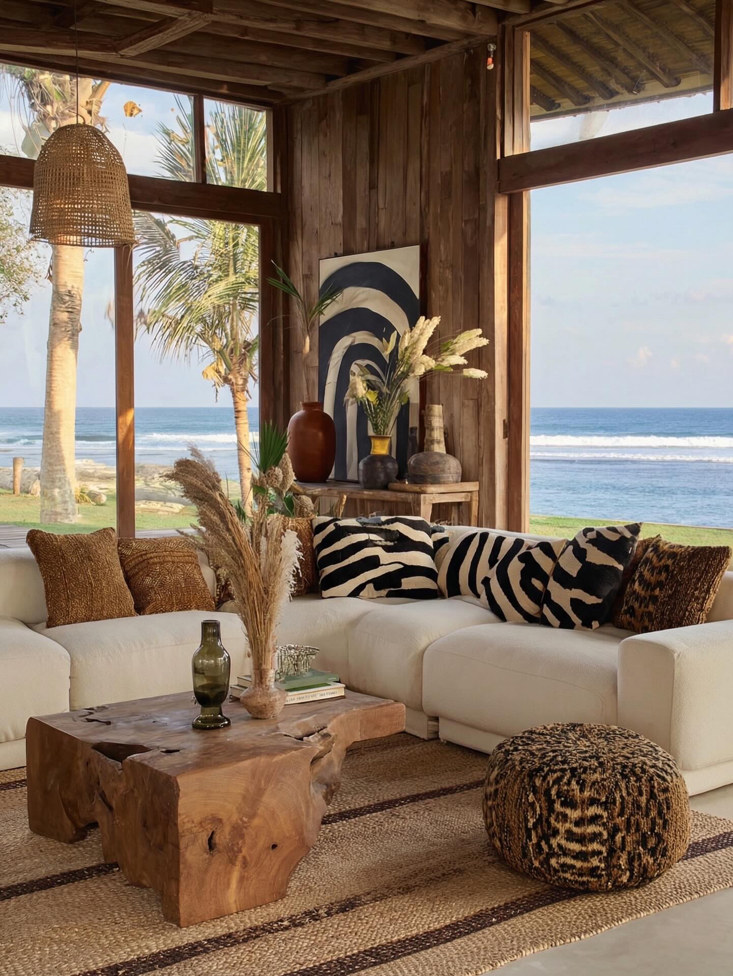 Woven materials, carved wood, soft textiles, and ceramics come together in a way that feels curated rather than crowded.